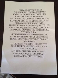 Nos lo cuenta Lleidatans que no volen laindependència. Algunos vecinos de Tarragona que muestran la senyera de tots al balcó s’han trobat això a la bústia. Es inútil: en Cataluña se está perdiendo el miedo.