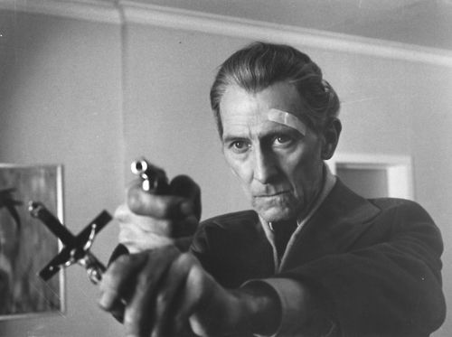 Observen si no la actitud amenazante de esta caricatura del actor Peter Cushing en su papel de caza vampiros; si bien sostiene la Cruz con la mano izquierda, va limpio y bien vestido con chaqueta y corbata de la época, señal inequívoca de derechismo.