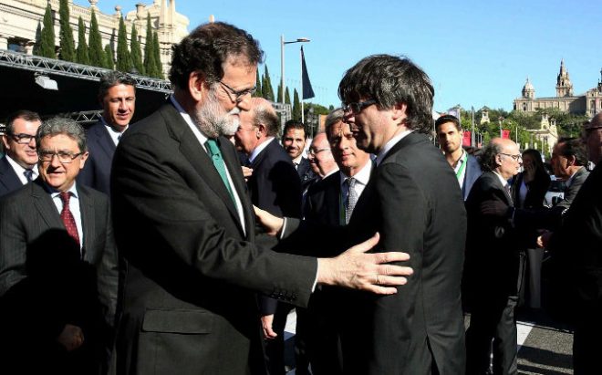 ‹‹Eso no va a entrar en vigor››. Insólita, por lo poco frecuente, comparecencia de Rajoy ante los medios de comunicación para dar su opinión sobre lo dicho con descaro y desvergüenza por Puigdemont en Madrid.