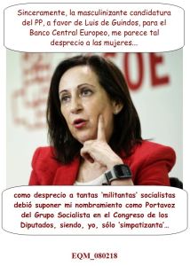 «Lamentamos profundamente que, habiendo tantas mujeres técnicamente tan preparadas, una vez más el Gobierno de Rajoy haya hecho un desprecio a las mujeres y haya propuesto a Guindos«, ha afirmado Margarita Robles, simpatizante del PSOE y Portavoz del Grupo Socialista en el Congreso de los Diputados, en unas declaraciones en los pasillos del Congreso.