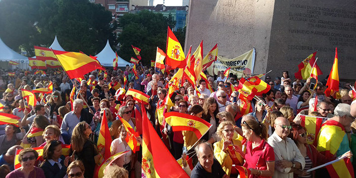 Tras su llenazo de este mediodía en Barcelona, Vox ha vuelto a conseguir un éxito de movilización esta misma tarde en la Plaza de Colón de Madrid para pedir la convocatoria de nuevas elecciones.