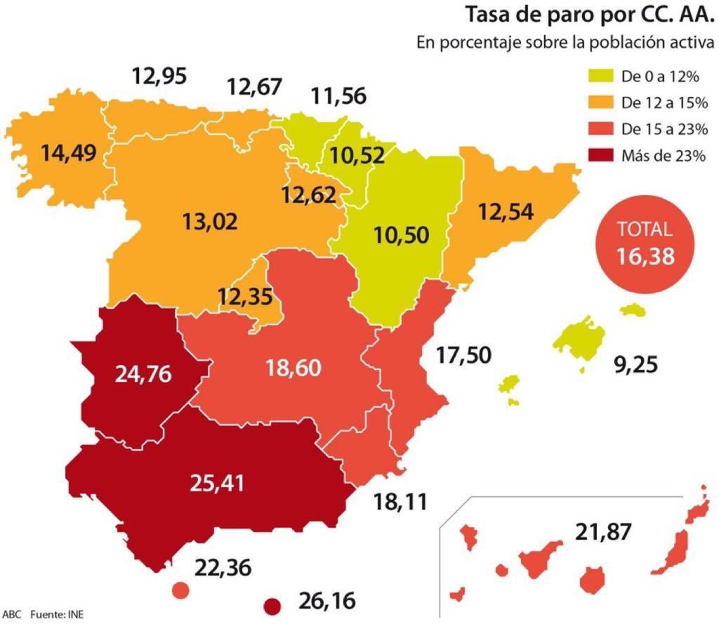 En rojo #PSOE las comunidades con más tasa de paro de España, casualmente son las dos en las que más tiempo hemo sufrido las políticas socialistas, tasas siempre en entornos del 25-30%