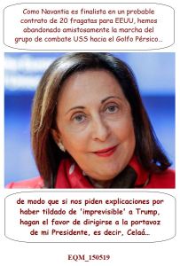 «[…] ha justificado este martes en Bruselas la retirada de la fragata Méndez Núñez, que estaba previsto que acompañara al portaaviones estadounidense Abraham Lincoln, porque Estados Unidos ha cambiado la misión original. Según la ministra, España había acordado hace dos años con EE UU la presencia de la fragata en esta misión, como ejercicio práctico y para conmemorar los 500 años de la vuelta al mundo de Magallanes-Elcano.» [El País, 140519]