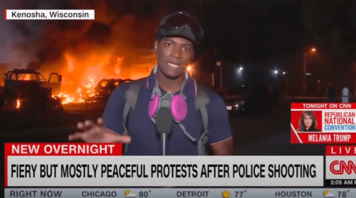 CNN está una vez más bajo fuego por un chyron en uno de sus segmentos de noticias. Un reportero de CNN está parado frente a un estacionamiento de autos en llamas, mientras que las palabras debajo de él dicen «protestas ardientes pero en su mayoría pacíficas después del tiroteo de la policía».