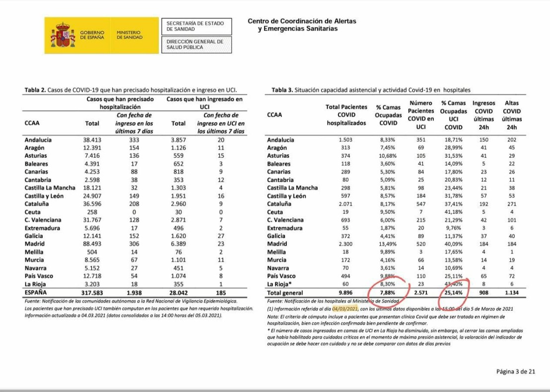 Estas son las cifras del Ministerio de Sanidad, para la ocupación de los Hospitales por Covid a día 4 de marzo de 2021.