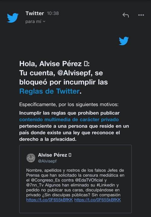 NUESTRA ESPAÑA / Hoy viernes día 3 de diciembre, se ha bloqueado la cuenta oficial de Twitter de Alvise Pérez, por incumplir las Reglas de Twitter al haber publicado los rostros de los Jefes de Prensa de los partidos políticos que firmaron el acuerdo para instar a la Cámara Baja a «tomar medidas» contra determinados medios de comunicación.