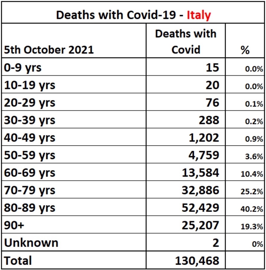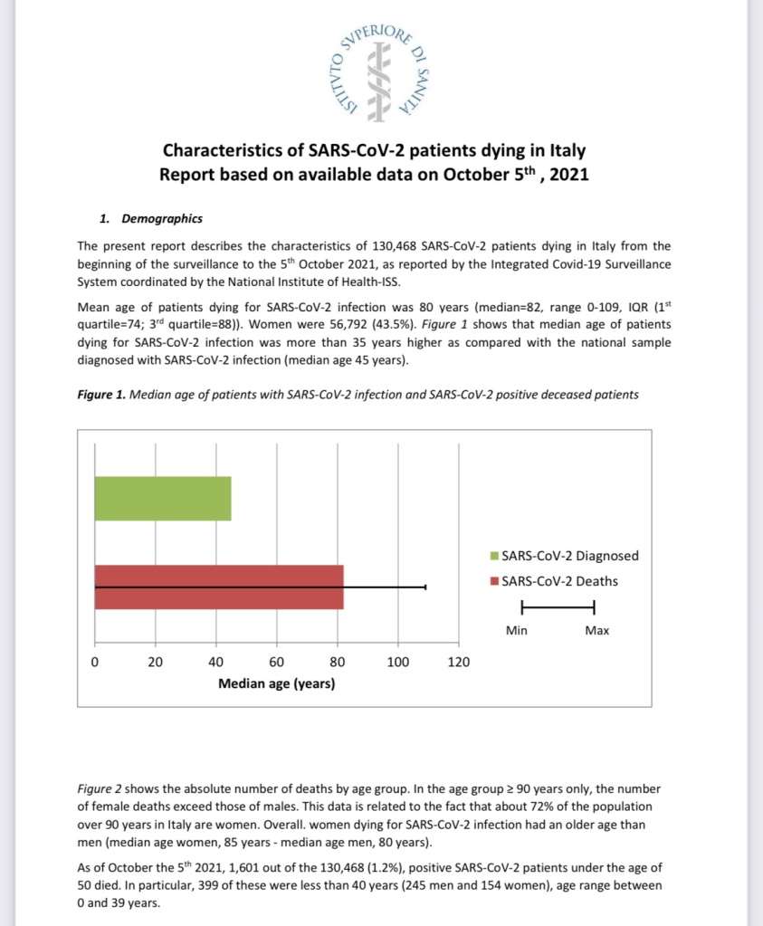 El informe enlazado a continuación muestra los grupos de edad de las 130.468 personas que murieron por Covid-19 en Italia hasta el 5 de octubre de 2021, según los datos del Sistema Integrado de Vigilancia de Covid-19 coordinado por el Instituto Nacional de Salud-ISS. La edad media de los pacientes que murieron por infección de SARS-CoV-2 fue de 80 años (mediana de 82 años) https://www.epicentro.iss.it/en/coronavirus/bollettino/Report-COVID-2019_5_october_2021.pdf