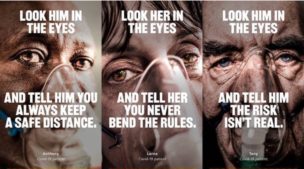 Quién puede olvidar las constantes imágenes durante la pandemia advirtiendo a las personas que permanezcan en sus casas para ‘salvar vidas’, los estudiantes a los que se les decía que romper las reglas sería ‘matar a su abuela’, o la campaña ‘Míralo a los ojos’, que mostraba a los pacientes de Covid en el hospital con una máscara de oxígeno, implorando a las personas que nunca rompan las reglas y que mantengan una «distancia segura» de los demás. Incluso ahora, a medida que el número de casos de covid sigue cayendo, estamos rodeados de vallas publicitarias que muestran partículas negras de covid flotando en el aire como humo, envolviendo a las personas que realizan su vida cotidiana.