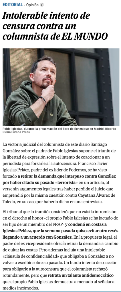 The court that processed it considered that there was no interference in the right to honor -Pablo Iglesias himself has boasted of being the son of a member of the FRAP- and ordered Iglesias Pelaez to pay the costs, who last week wanted to avoid another setback by reaching an agreement with Gonzalez. In the legal proposal, the father of the former vice-president offered to withdraw the lawsuit in exchange for the costs. But it also included an intolerable «confidentiality clause» that obliged Gonzalez not to write about his past. A crude attempt of coercion to force him to self-censor, which the columnist flatly rejected, but which portrays an anti-democratic mood that Pablo Iglesias himself often demonstrates when pointing out uncomfortable media.