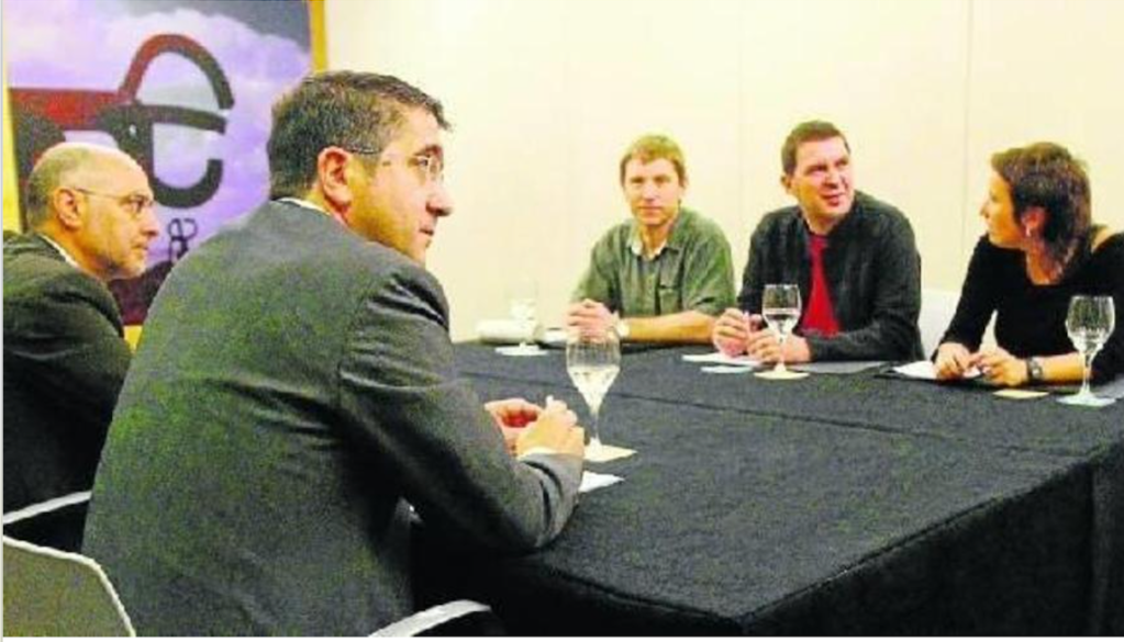 Rodolfo Ares y Patxi López con Rufi Etxebarria, Arnaldo Otegi y Olatz Dañobeitia en el Amara Plaza. Fuera, Pilar Ruiz Albisu y Mapi de las Heras les afeaban la traición.