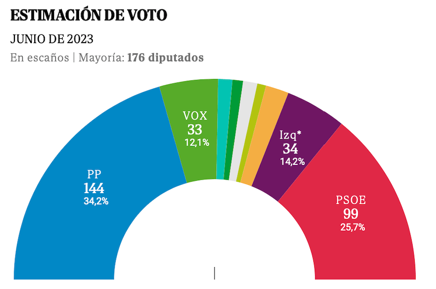 Sigma Dos ha vuelto a preguntar por su intención de voto a los españoles después de conocidos los resultados de las elecciones municipales y autonómicas. Y viene a resultar que el PP aumenta considerablemente su representación parlamentaria. De los 89 diputados que obtuvo en las generales de 2019, subiría hasta los 144 que le augura Sigma Dos, un aumento de 55 escaños. Otra suerte, muy distinta y peor, es la del PSOE, que de los 120 escaños que tiene esta legislatura, bajaría hasta los 99, con una pérdida de 21. Los sanchistas desaforados, después de oír a su líder, pudieron llegar a la conclusión de que es el PSOE quien ha ganado 55 escaños, pero no hay tal.