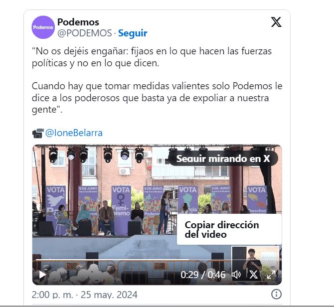 UN INCISO: No puedo publicar algunos tweets porque me tienen bloqueado, así es la izquierda, además de opresora y totalitaria, COBARDE. Este tweet, del Partido-chusma «Podemos» es un ejemplo, así que, en su lugar, subo una captura de pantalla, lo malo es el vídeo, claro, pero bueno, no es mas que otro mitin panfletario de la cajera de DIA esta. ¿Que que dice? REBUZNA, como ha hecho desde pequeña.