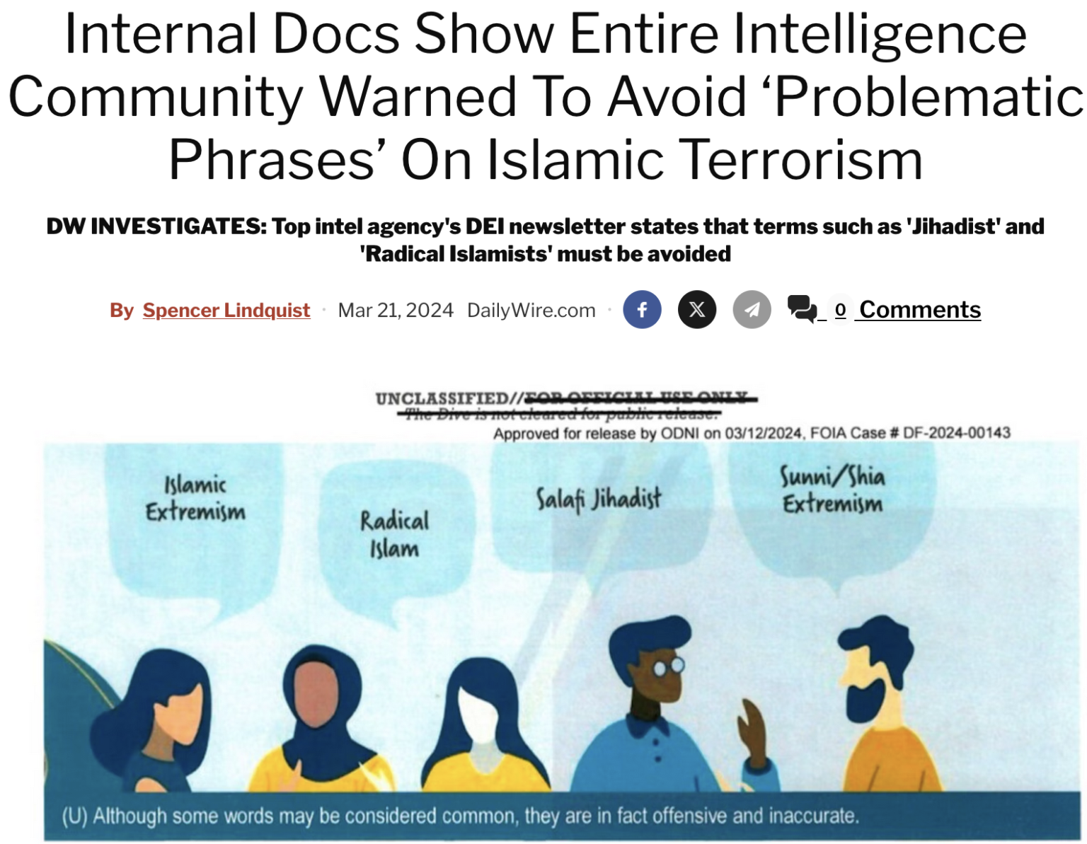 Durante la administración Obama, la CIA y el FBI eliminaron términos como “yihad” y referencias al Islam de los documentos de entrenamiento de la IC de la era Bush, y su DHS adoptó una nueva nomenclatura, abandonando la “Guerra Global contra el Terror” en favor de “Operaciones de Contingencia en el Exterior” y declarando que en adelante el terrorismo islámico sería llamado “Desastre Causado por el Hombre”.