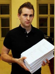 En el video nos explican el caso de Max Schrems, un austriaco estudiante de derecho de 24 años que usaba su perfil de Facebook para relacionarse con sus amistades, subir fotos, lo normal. Hace unos meses (en Julio) Max solicitó a Facebook una copia de todos los datos que tenía almacenado sobre su perfil, armado de la directiva europea 95/46/CE que garantiza el acceso de cualquier ciudadano a sus datos. Facebook, en respuesta, le entregó un CD con más de 1200 documentos en PDF (en la foto sale Mark posando con estos documentos impresos). Max se sorprendió de la cantidad de información recopilada sobre su persona y se dedico a investigar sobre posibles violaciones a sus derechos.