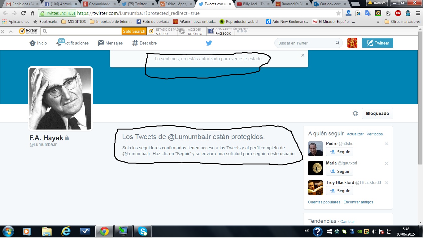 Por cierto, el sujeto, como se ve en el enlace del artículo, ha cambiado la foto de perfil y entrando con dicho enlace, efectivamente, dice que la cuenta está protegida y … bueno, se ve esto exactamente: