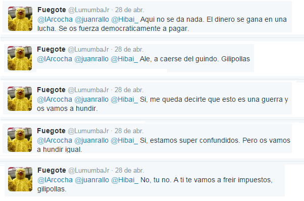 A lo largo de la charla virtual, su cuenta de Twitter (@LumumbaJr) anticipó importantes subidas de impuestos que justificó afirmando que «el dinero se gana en una lucha. Se os fuerza democráticamente a pagar». Cuestionado por este planteamiento, llamó «gilipollas» a su interlocutor y añadió que «esto es una guerra y os vamos a hundir«, a lo que sumó otro mensaje en el que habló de «freír a impuestos» a su interlocutor.