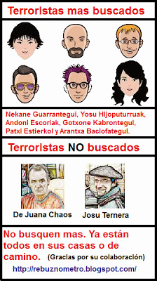Políticos de todo el arco parlamentario, jueces de todos los pelajes, sindicalistas, periodistas y comentaristas de los distintos medios de comunicación etc. etc., podrán debatir y adornarlo de la forma que quieran, que si la ETA ha sido o no derrotada, que si ha habido concesiones políticas o no, que si todo está pactado o que no, que es una tragedia para las victimas, que es vomitivo, que es un insulto, que no quedaba otro remedio, que hay que acatar las leyes, que la culpa es del sistema, que los jueces son indecentes, que están politizados, que la culpa es de los políticos, de Europa, de Estrasburgo etc. etc., pero en el tema de la ETA, la realidad es que la sociedad española ha puesto los muertos, que la democracia se ha plegado ante una banda criminal, que los etarras y quienes les apoyan o amparan se han salido con la suya, que no han entregado las armas y que ahora no matan porque no les hace falta para conseguir sus fines. Mas adelante, si no está pactado ya, pedirán la independencia y la integración de Navarra en el País Vasco y si no se les concede volverán a matar. Al tiempo.