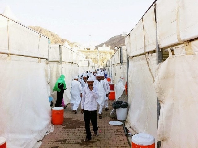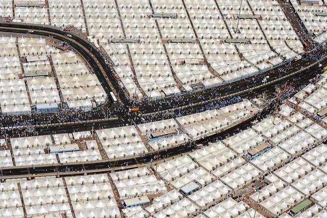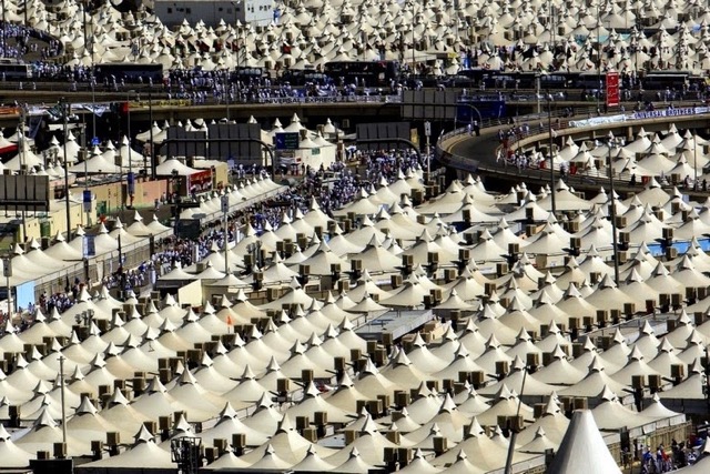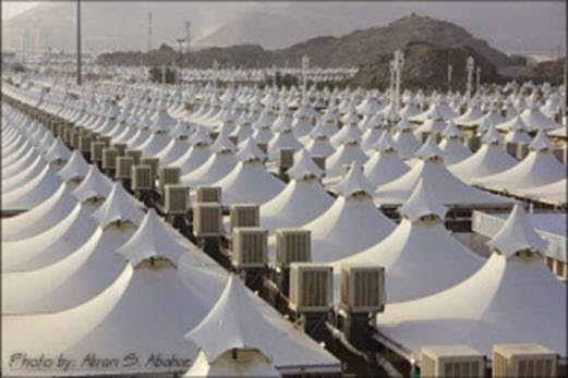 Mina, el poblado de tiendas para los peregrinos de La Meca. Estas tiendas están climatizadas y son ininflamables. Dispone cada una de ellas de un altavoz, una televisión, un termómetro y un detector de incendios.