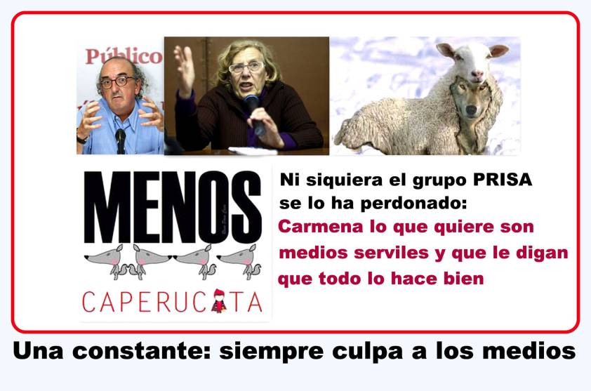 «…Carmena dice que se siente huérfana, que le falta acompañamiento mediático, lo cual es una absoluta memez. Si Carmena dijera eso de los medios de papel, se lo podría aceptar. Es verdad que dentro de lo que son los medios de papel, ahí a Carmena le faltan apoyos mediáticos. Pero en Internet y sobre todo en las televisiones, especialmente dos, van a muerte con Carmena. Una es Cuatro, otra la Sexta y te diría también parte de Telecinco donde tienen a una tertuliana estrella como es Tania Sánchez. Cada vez que Carmena tiene que explicar algún fracaso o algo de su nefasta gestión, siempre culpa a los medios de comunicación, Carmena no quiere entender que los medios no estamos para darle calor o darle abrigo o para decirle que todo lo…